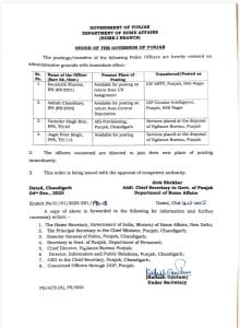 इससे पहले 2 दिसंबर को राज्य सरकार के गृह विभाग ने राज्यपाल के अनुमोदन और पंजाब राज्य निर्वाचन आयोग की सहमति के साथ दो वरिष्ठ पुलिस अधिकारियों के तबादले का आधिकारिक आदेश जारी किया था।इसमें आईपीएस अधिकारी हरमनबीर सिंह को डीआईजी पीएपी, जालंधर और आईपीएस अधिकारी स्नेहदीप शर्मा (SPS: 2011) को डीआईजी फिरेजपुर रेंज, फिरेजपुर की जिम्मेदारी सौंपी थी।इससे पहले 1 आईएएस और 3 पीसीएस अफसरों के तबादले किए गए थे।