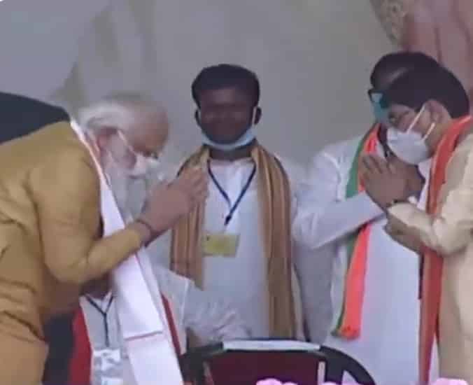 भोपाल, डेस्क रिपोर्ट। पश्चिम बंगाल (West Bengal) में चुनावी (election) मौसम है और इस दौरान लगातार कुछ न कुछ अनोखे नजारे देखने को मिलते हैं। लेकिन बुधवार को कुछ ऐसा हुआ कि हर कोई देखता ही रह गया। एक चुनावी रैली में बीजेपी कार्यकर्ता पीएम नरेंद्र मोदी (PM Narendra Modi) के पैर छूने आगे बढ़ा, लेकिन ये क्या पीएम मोदी ने पलटकर कार्यकर्ता के ही पैर छू लिये।