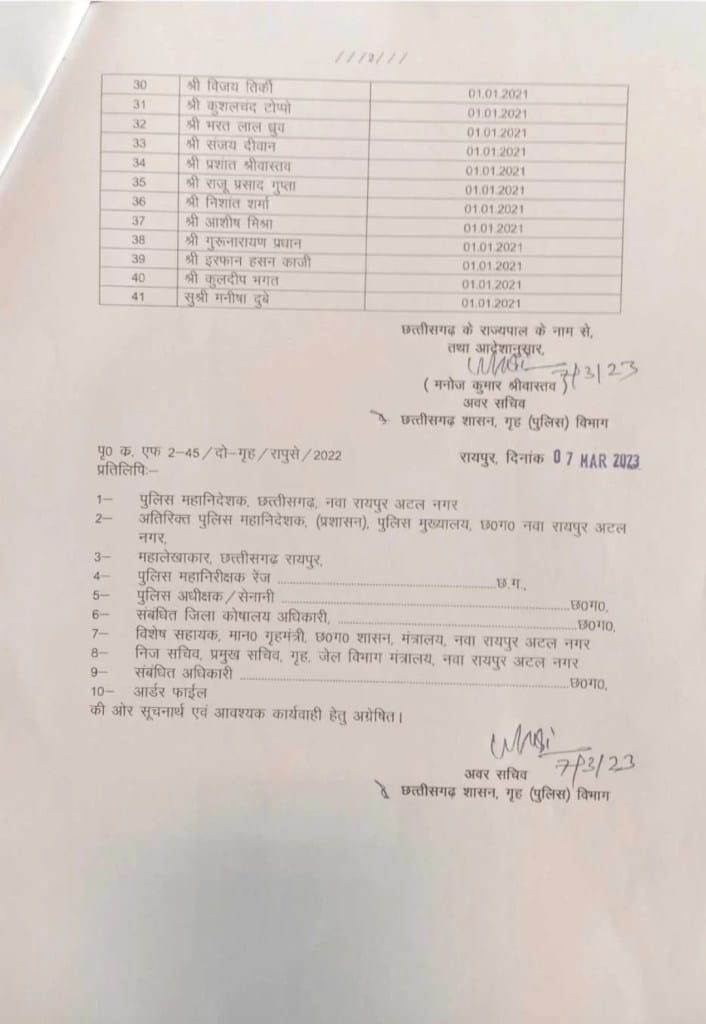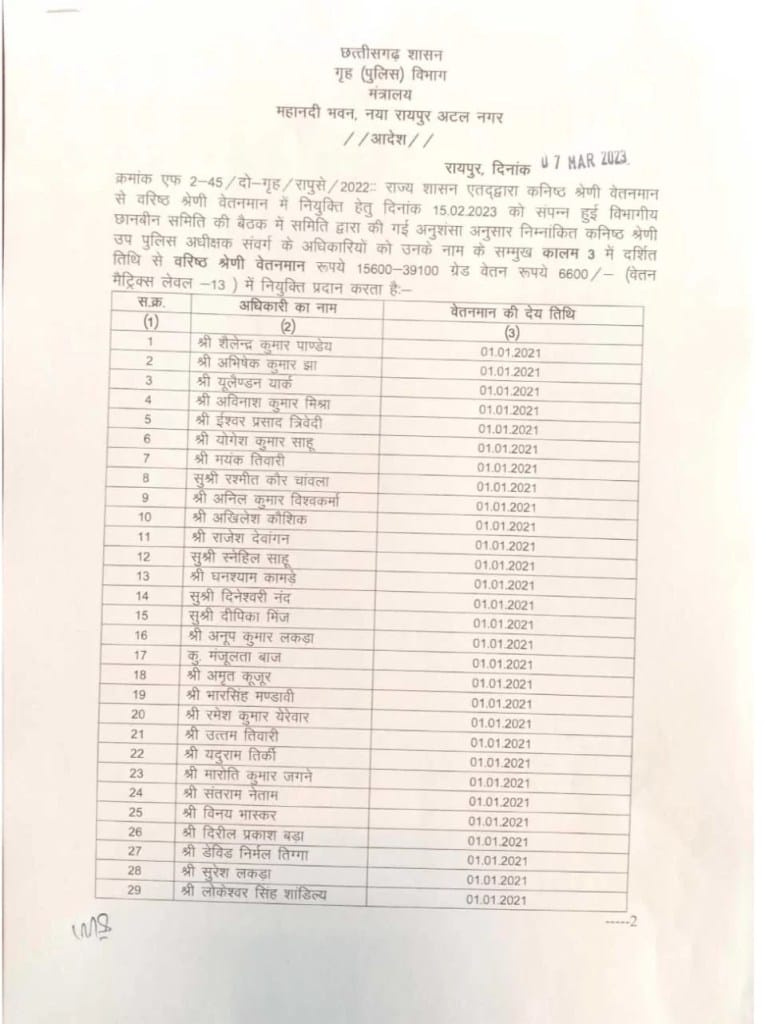 छत्तीसगढ़ के गृह विभाग द्वारा 15 फरवरी 2023 को संपन्न हुई विभागीय छानबीन समिति की बैठक में की गई अनुशंसा के आधार पर राज्य पुलिस सेवा के अधिकारियों को उप पुलिस अधीक्षक संवर्ग से पदोन्नत करते हुए उन्हें प्रमोशन का लाभ दिया गया है। उन्हें वरिष्ठ श्रेणी वेतनमान के तहत 15600-39100 ग्रेड वेतन रुपए 6600 के तहत पे मैट्रिक्स लेवल 13 का लाभ दिया जाएगा।