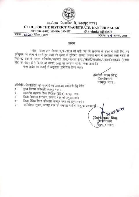 उत्तर प्रदेश में लगाार हो रही बारिश के चलते कई जिलों में अवकाश घोषित कर दिया गया है। आज मंगलवार को शाहजहांपुर,चंदौली, चित्रकूट,सोनभद्र, औरेया,श्रावस्ती व सीतापुर में कक्षा 1 से 8 तक के सभी परिषदीय विद्यालयों और अलीगढ़, लखनऊ,जनपद कानपुर नगर के कक्षा नर्सरी से कक्षा-12 तक के समस्त परिषदीय / सहायता प्राप्त / मान्यता प्राप्त/समस्त बोर्ड के विद्यालयों मे अवकाश घोषित किया गया है।उक्त आदेश का कड़ाई से अनुपालन सुनिश्चित किया जाये।
