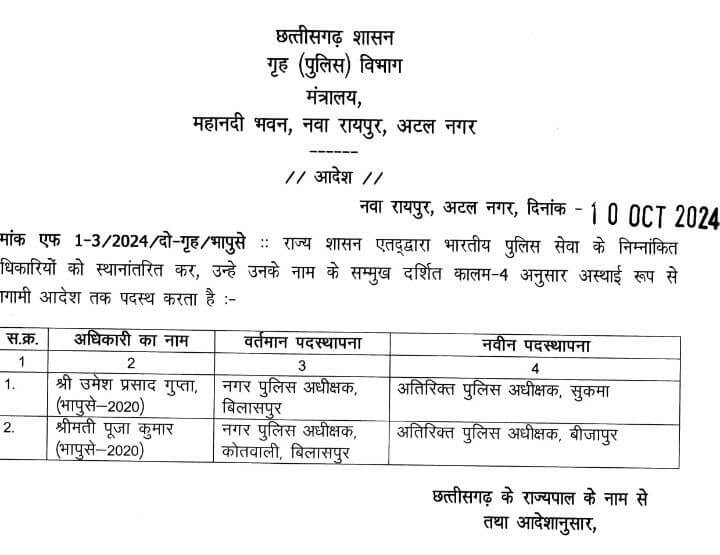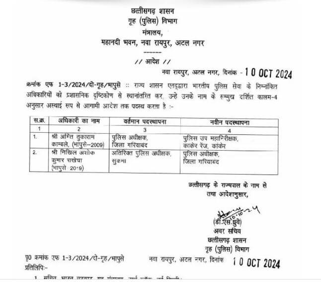 छत्तीसगढ़ में 4 आईपीएस के तबादले