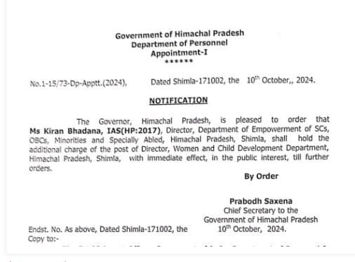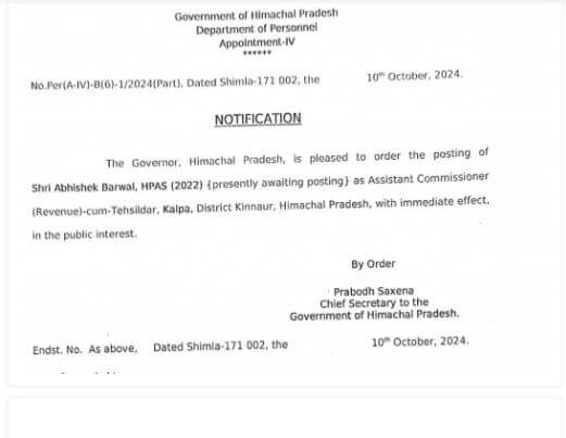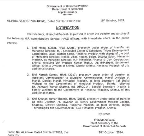 मुख्य सचिव प्रबोध सक्सेना की तरफ से जारी अधिसूचनाके मुताबिक एचएएस अधिकारी मनोज कुमार को राज्य अल्पसंख्यक वित्त एवं विकास निगम शिमला में प्रबंध निदेशक, नरेश कुमार को संयुक्त सचिव जलशक्ति विभाग और कृष्ण कुमार शर्मा को संयुक्त निदेशक डिजिटल टेक्नॉलाजी एवं गर्वनेंस के पद पर स्थानांतरित कर दिया है। नियुक्ति के लिए प्रतीक्षारत एचएएस अधिकारी अभिषेक बरवाल को तहसीलदार कल्पा नियुक्त किया गया है।