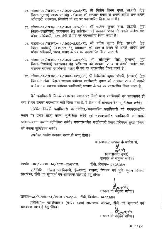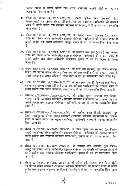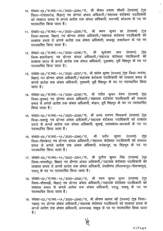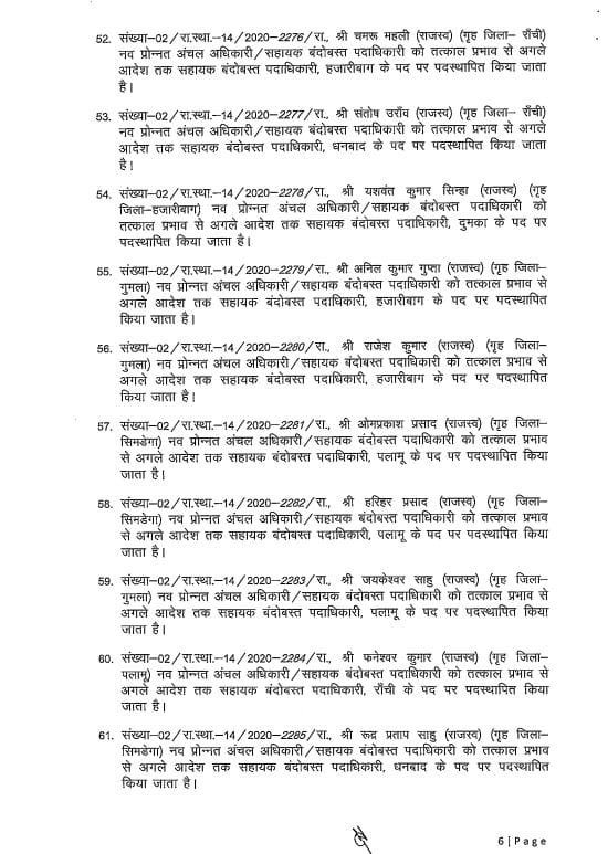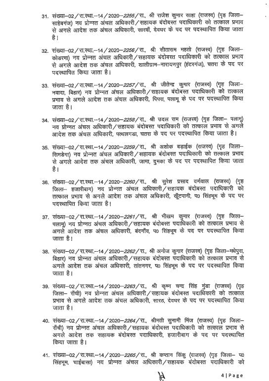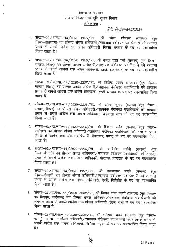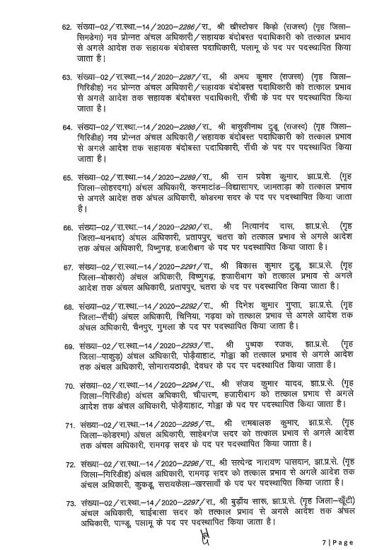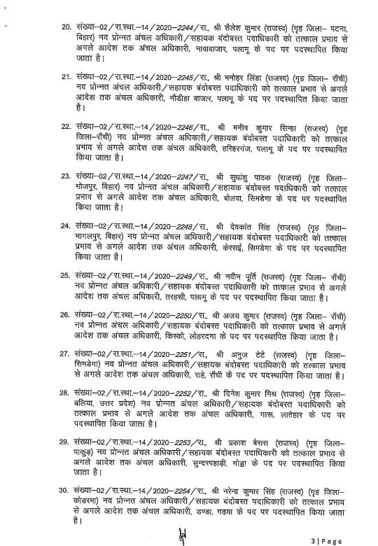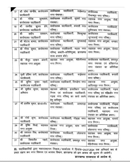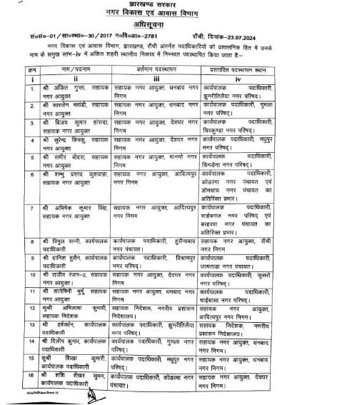 जारी अधिसूचना के मुताबिक हिम्मत लाल महतो को अगले आदेश तक रांची हेहल का अंचल अधिकारी, कमल कांत वर्मा को हजारीबाग डाड़ी का राजस्व अधिकारी और जीतेंद्र प्रसाद को धनबाद के टुंडी में अंचल अधिकारी के रूप में पदास्थापित किया गया है।वही नगर विकास एवं आवास विभाग ने 31 पदाधिकारियों का ट्रांसफर किया गया है। फुसरो नगर पंचायत में कार्यपालक पदाधिकारी के पद पर पदस्थापित गोपेश कुम्भकार को रांची का सहायक नगर आयुक्त बनाया गया है।