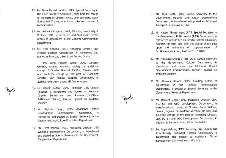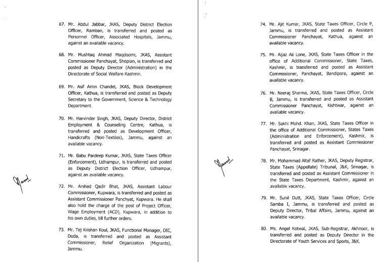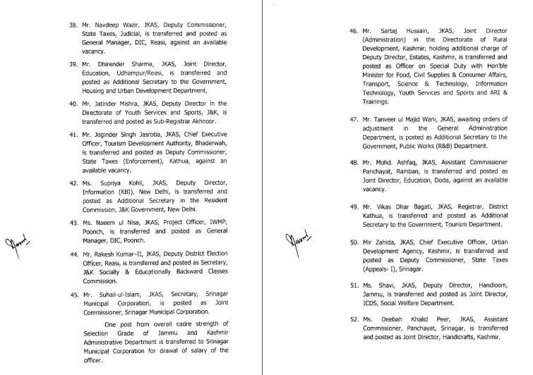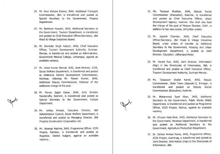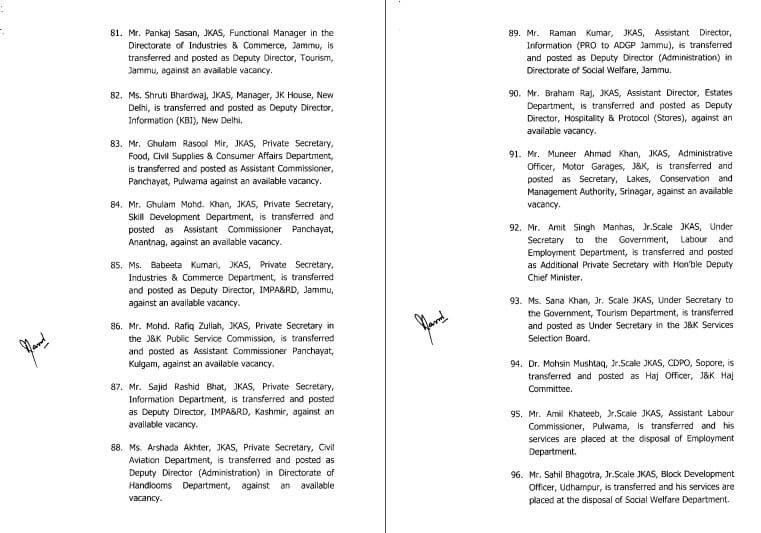 - मलिकज़ादा शेराज़ उल हक, जेकेएएस, विशेष सचिव, संस्कृति विभाग, को उपलब्ध रिक्ति पर अतिरिक्त जिला विकास आयुक्त, राजौरी ।