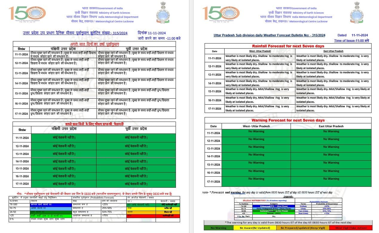 यूपी मौसम विभाग की मानें तो पश्चिमी विक्षोभ के सक्रिय ना होने से 11, 12, 13 और 14 नवंबर को पूर्वी और पश्चिमी यूपी में मौसम साफ रहने वाला है, दोनों हिस्सों में सुबह के समय कहीं-कहीं छिछला से मध्यम कोहरा छाया रहेगा। 15 नवंबर को धुंध और छिछला कोहरा छा सकता है तो 16 नवंबर को सुबह के समय सिर्फ धुंध छाने के आसार है। तापमान में अभी कुछ ज्यादा बदलाव होने की संभावना नहीं है, लेकिन आने वाले दिनों में न्यूनतम तापमान में 2 से 3 डिग्री की गिरावट आने से कई जिलों में रात को कड़ाके की ठंड पड़ सकती है।
