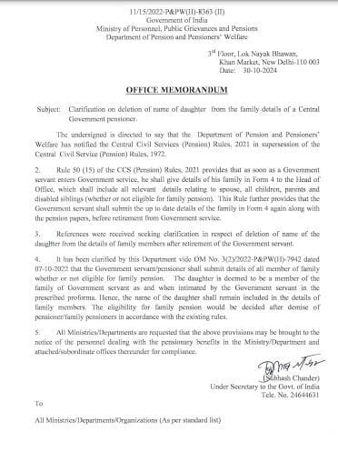 DoPPW द्वारा जारी किए गए मेमोरैंडम में यह स्पष्ट किया गया है कि जो पेंशन का फॉर्मेट होता है उसमें बेटी को भी सरकारी कर्मचारी के परिवार का सदस्य माना जाता है। इसलिए बेटी का नाम भी परिवार के सदस्यों की लिस्ट में शामिल किया जाए। केंद्रीय सिविल सेवा (पेंशन) नियम, 2021 के मुताबिक, अगर परिवार में सौतेली और गोद ली गई बेटियों के अलावा अविवाहित, विवाहित और विधवा बेटियां हैं, तो इसमें उन सभी का नाम शामिल किया जाना चाहिए।जमा किए गए फॉर्म 4 में सरकारी कर्मचारियों द्वारा एक बार नाम देने के बाद, बेटी को फैमिली के परिवार के आधिकारिक सदस्य में गिना जाता है।