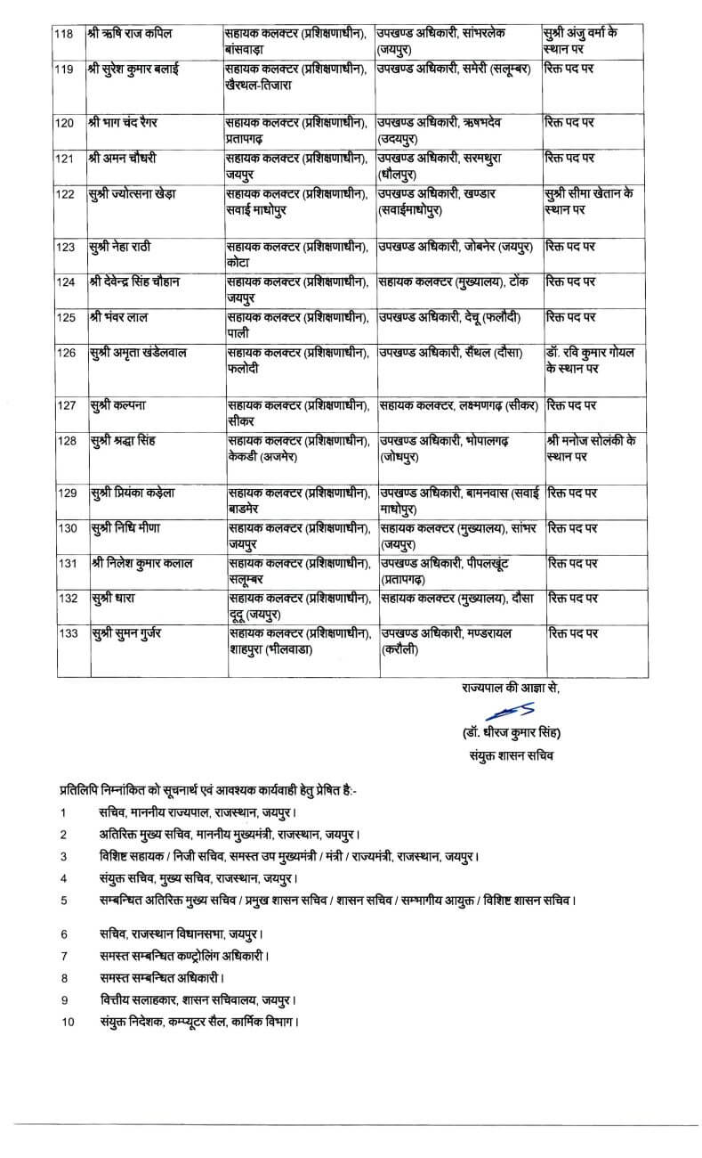 राजस्थान में बड़ा प्रशासनिक फेरबदल किया गया है। राज्य की भजनलाल सरकार ने शनिवार देर रात 12 प्रशिक्षु आईएएस और 142 आरएएस अफसरों का तबादला किया है। 10 आईएएस को प्रशिक्षण के बाद फील्ड पोस्टिंग दी गई है और 115 एसडीएम बदले गए है। इस संबंध में कार्मिक विभाग ने अलग अलग आदेश जारी किए है।