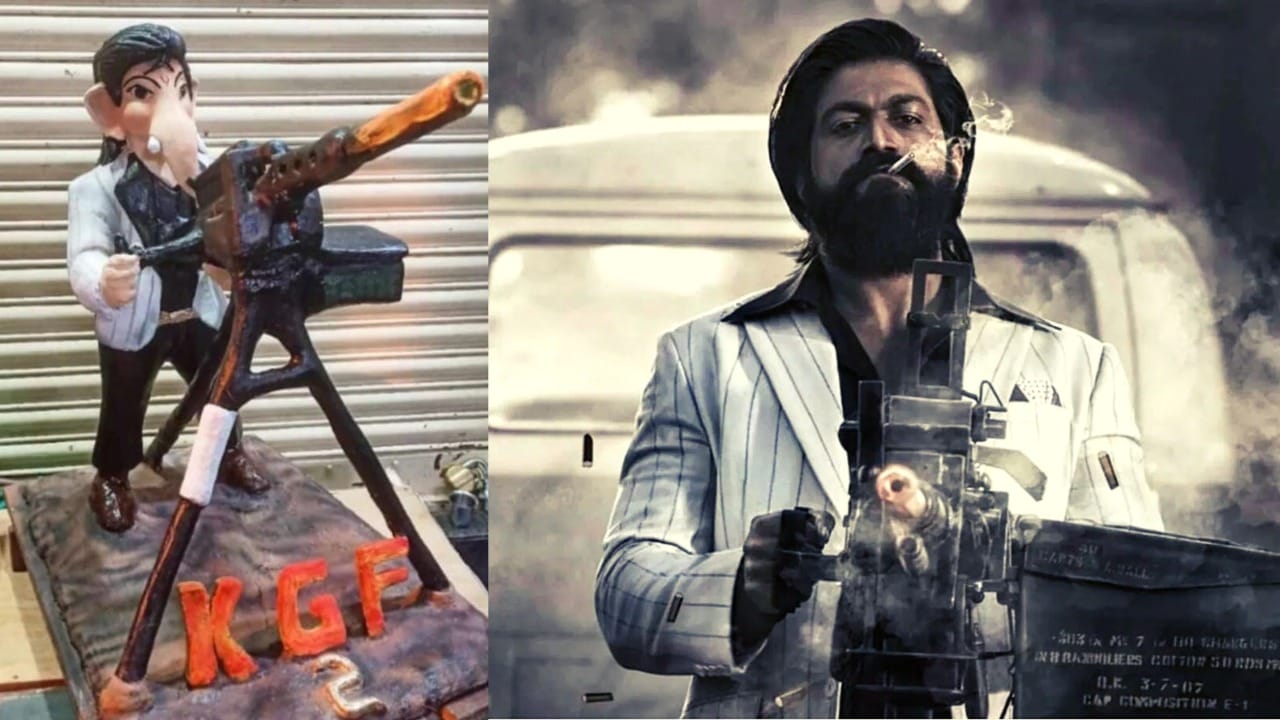 इस तस्वीर में गणपति बाप्पा के हाथ में बंदूक थमाई हुई नजर आ रही है। इस तस्वीर को देखने के बाद भक्तों का गुस्सा फूट गया है। बताया जा रहा है कि KGF यश की धुंआधार लुक को कॉपी कर गणपति की मूर्ति बनाने के बाद जब उसका लुक सामने आया तो विवाद मच गया। आप तस्वीर में देख सकते हैं केजीएफ चैप्टर टू से इंस्पायर होकर मूर्तिकार ने गणेश जी की हैवी मशीनगन के साथ मूर्ति बनाई है। इस मूर्ति में देखा जा सकता है गणेश जी को सिग्नेचर व्हाइट पिनस्ट्राइप्ड सूट पहनाया है। साथ ही उनके हाथों में बंदूक पकड़ाई है। वहीं मूर्ति के नीचे KGF 2 लिखा हुआ है।