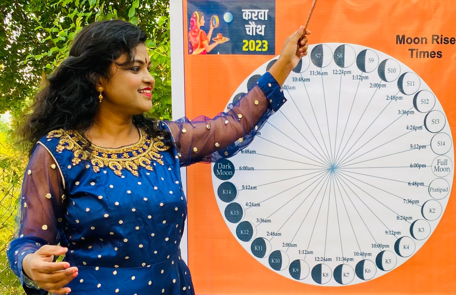 चंद्रोदय का खगोलविज्ञान बताने नेशनल अवार्ड प्राप्त विज्ञान प्रसारक सारिका घारू ने बताया कि आकाश मे इंतजार कराने वाला चंद्रमा आपको अपने घर आंगन या छत से करवाचौथ पर कितने बजे दिखेगा , इसकी गणना महिलाएं स्वयं सटीक रूप से कर सकती हैं । इसके लिए 31 अक्टूबर तृतीया तिथी को शाम आप चंद्रोदय का इंतजार करते हुए उसको आपके घर से देखने का समय नोट करेंं । इसमें 52 मिनिट जोड़कर जो समय आयेगा वह आपके करवाचौथ के चंद्रदर्शन का सटीक समय होगा ।