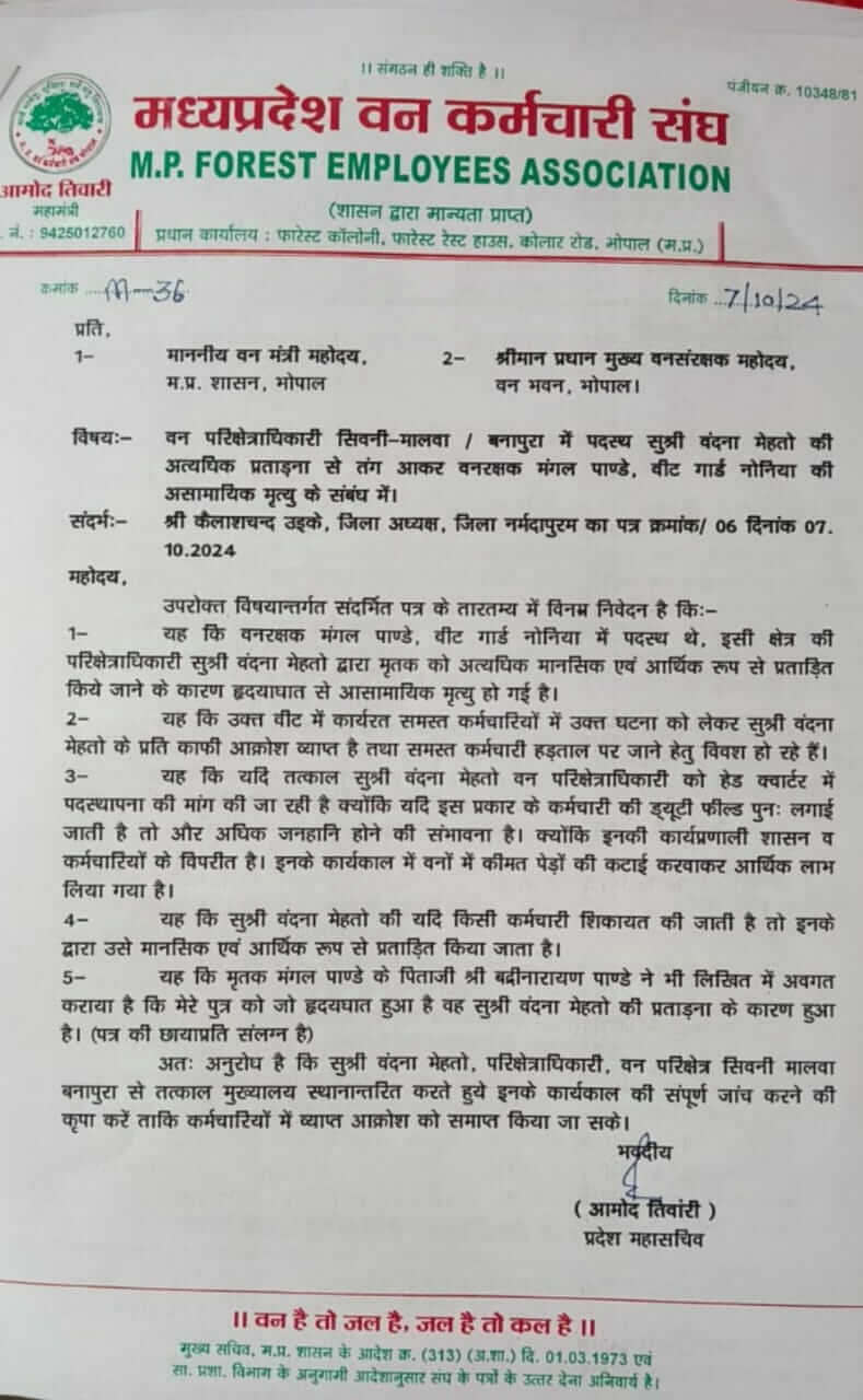 वन कर्मचारी नेताओं द्वारा शासन को भेजे गए पत्र में लिखा है कि वंदना मेहतो वन परिक्षेत्र अधिकारी सिवनी-मालवा के कार्यकलापों से आहत वन कर्मचारी आक्रोश में है कर्मचारियों ने आरोप लगाया है वन रक्षक मंगल पांडे से शासकीय आवास खाली करने का अत्यधिक दवाब डाला गया जिससे 2 अक्टूबर 2024 को हार्ट फेल हो जाने से उनकी मृत्यु हो गई, इसकी लिखित शिकायत पुलिस थाना सिवनी-मालवा में मंगल पांडे वनरक्षक के पिता ने की है।