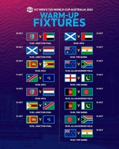 बता दें कि आईसीसी ने टूर्नामेंट में शामिल सभी 16 टीमों के अभ्यास मैचों का शेड्यूल जारी किया है। अक्तूबर के महीने में होने वाले इस टूर्नामेंट में पहले राउंड में खेलने वाली टीमें मेलबर्न में अपनी तैयारी शुरू करेंगी। वहीं 23 अक्टूबर से सुपर 12 के मुकाबले शुरू होंगे। इससे पहले सुपर 12 में क्वालीफाई करने वाली टीमें आपस में वार्मअप मैच में खेलेंगी। वर्ल्ड टी-20 के वार्मअप मैच 10 अक्टूबर से शुरु हो जाएंगे।