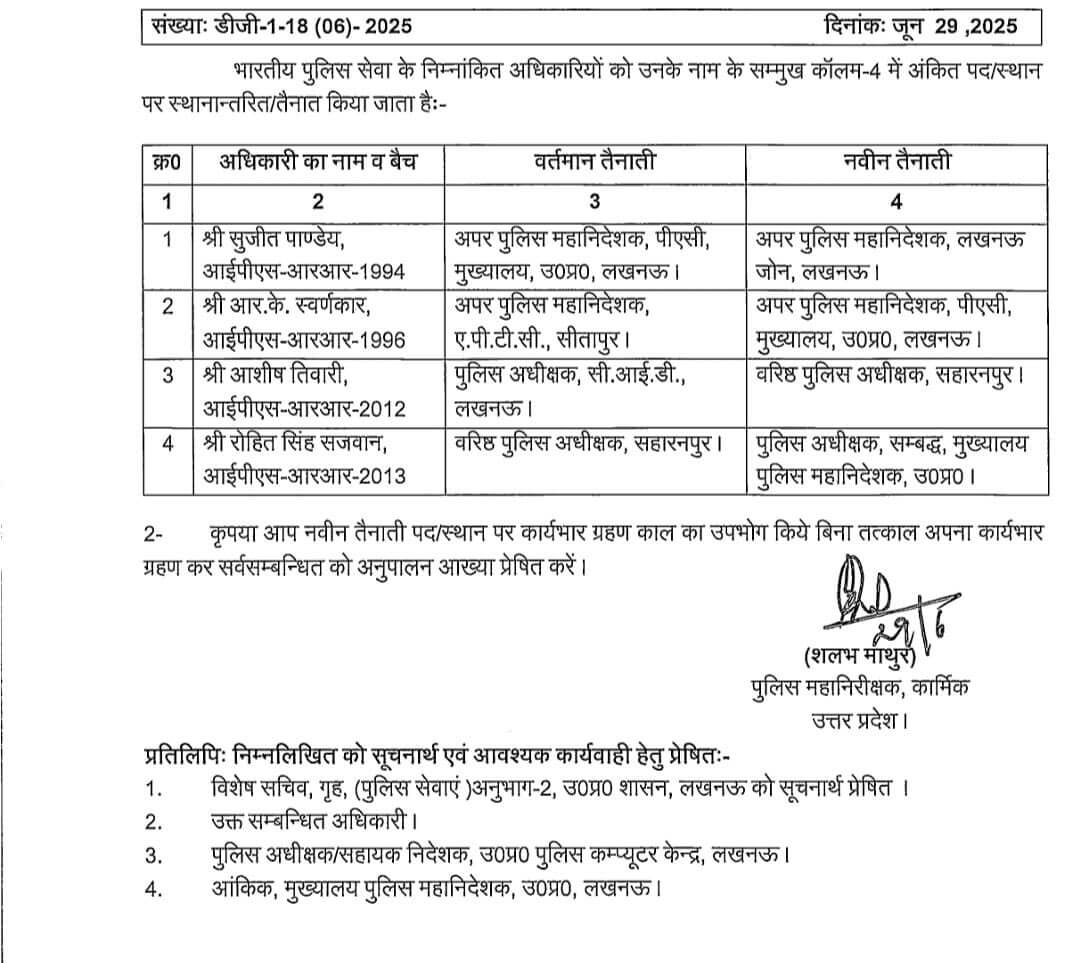 इन अफसरों में राजीव कृष्ण ,बी शिरोडकर ,सुजीत पांडे, आशीष तिवारी और रोहित सिंह के नाम शामिल है।एसबी सिरडकर को पुलिस महानिदेशक/अपर पुलिस महानिदेशक, लखनऊ जोन से पुलिस महानिदेशक, पुलिस प्रोन्नति एवं भर्ती बोर्ड, उप्र की जिम्मेदारी दी गई है।