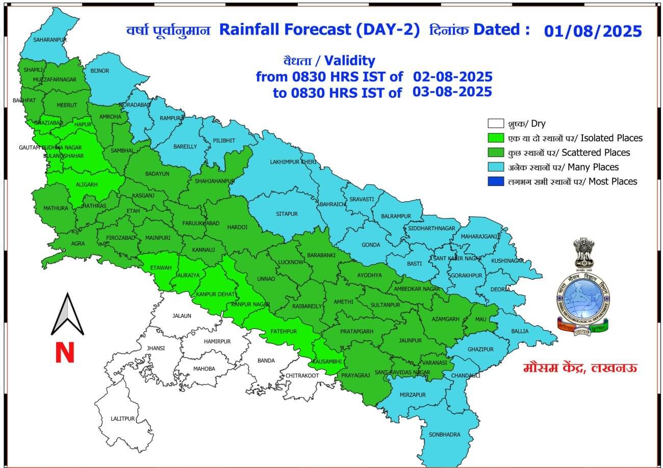 - 3-08-2025: पश्चिमी में कुछ / पूर्वी यूपी में अनेक स्थानों पर वर्षा/गरज-चमक के साथ बौछारें ।कहीं कहीं भारी बारिश मेघगर्जन और वज्रपात के आसार।