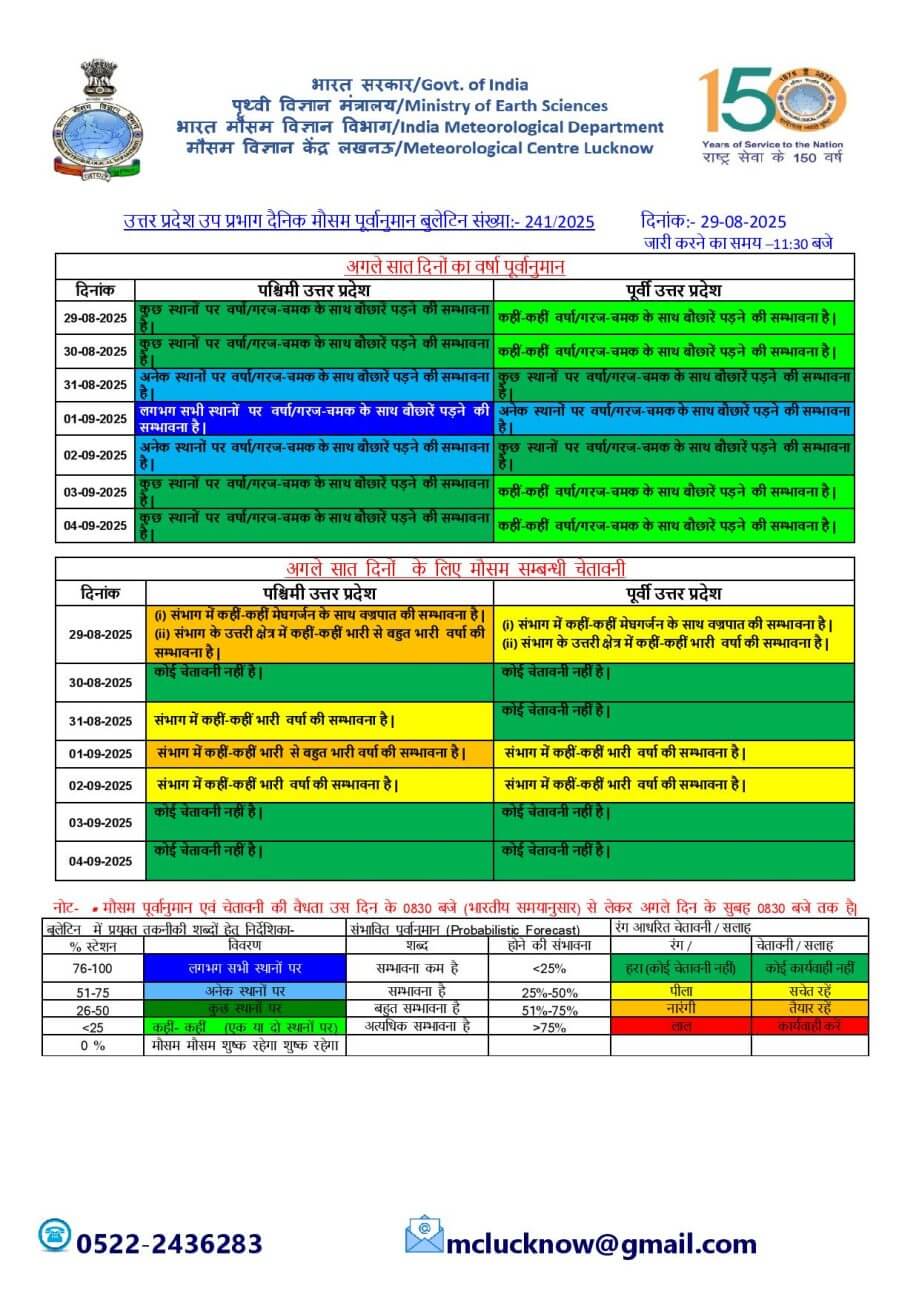 - 30-08-2025: पश्चिमी में कुछ / पूर्वी यूपी में कहीं कहीं स्थानों पर वर्षा/गरज-चमक के साथ बौछारें ।
