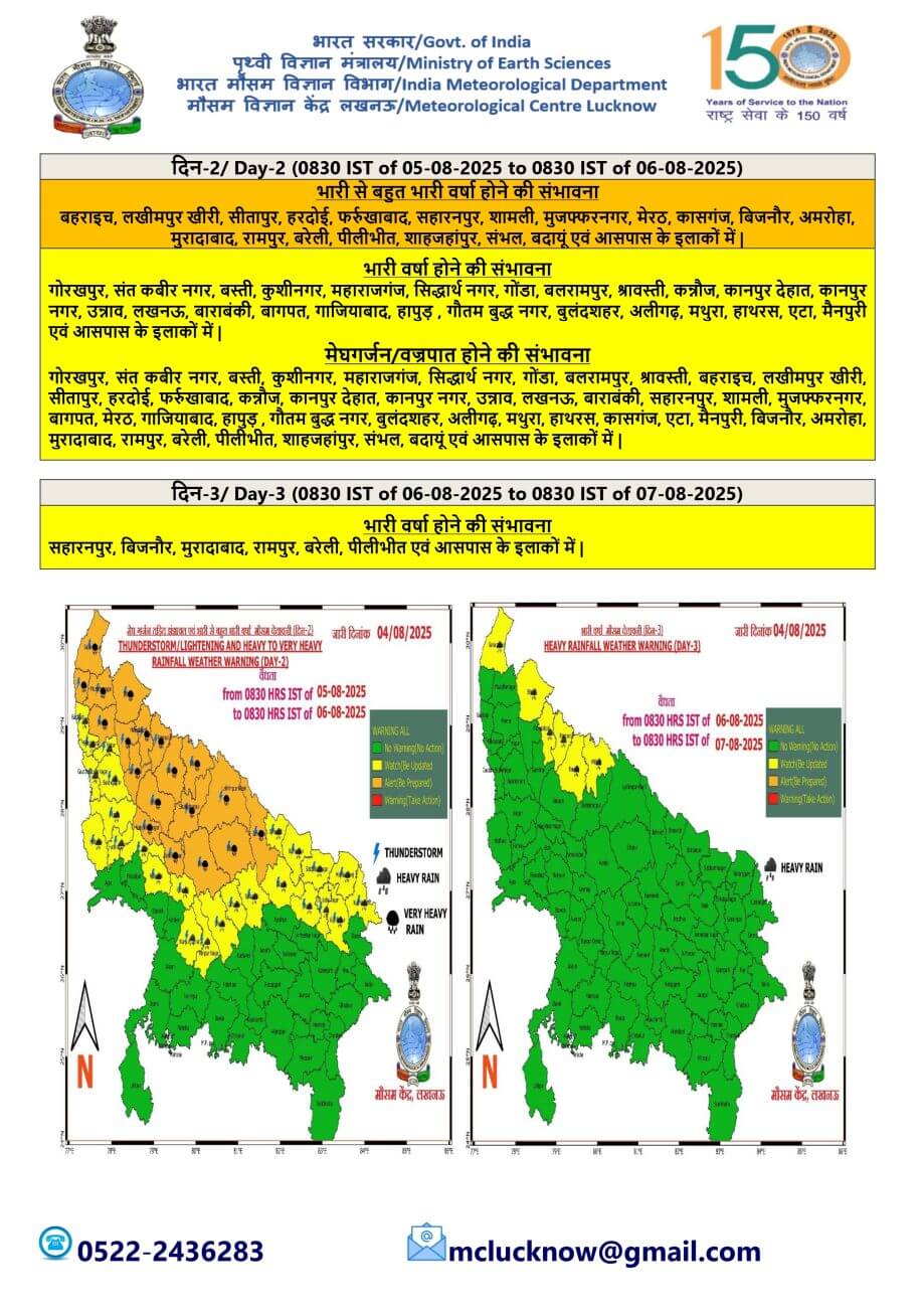 - 5-08-2025: पश्चिमी / पूर्वी यूपी में अनेक स्थानों पर वर्षा/गरज-चमक के साथ बौछारें ।कहीं कहीं भारी बारिश मेघगर्जन और वज्रपात के आसार।