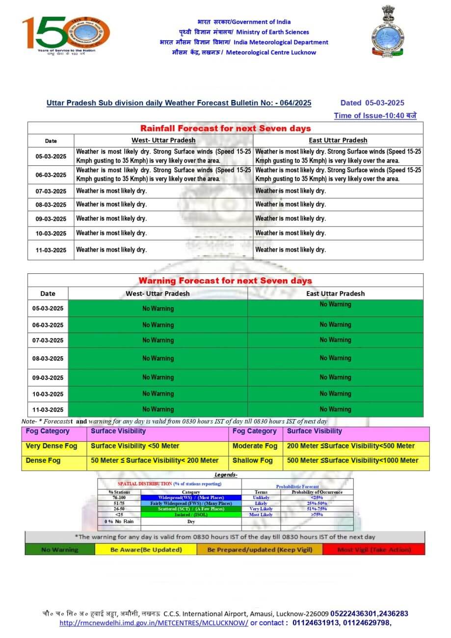 UP Weather Update : आज बुधवार को उत्तर प्रदेश में मौसम शुष्क और साफ रहेगा, लेकिन 20 से 30 किमी प्रति घंटा की रफ्तार से तेज हवा चलने की संभावना है।अधिकतम तापमान 28 और न्यूनतम तापमान 14 डिग्री सेल्सियस रहने की संभावना है।लखनऊ में तेज हवाओं के कारण सुबह और रात में हल्की ठंडक महसूस हो सकती है।