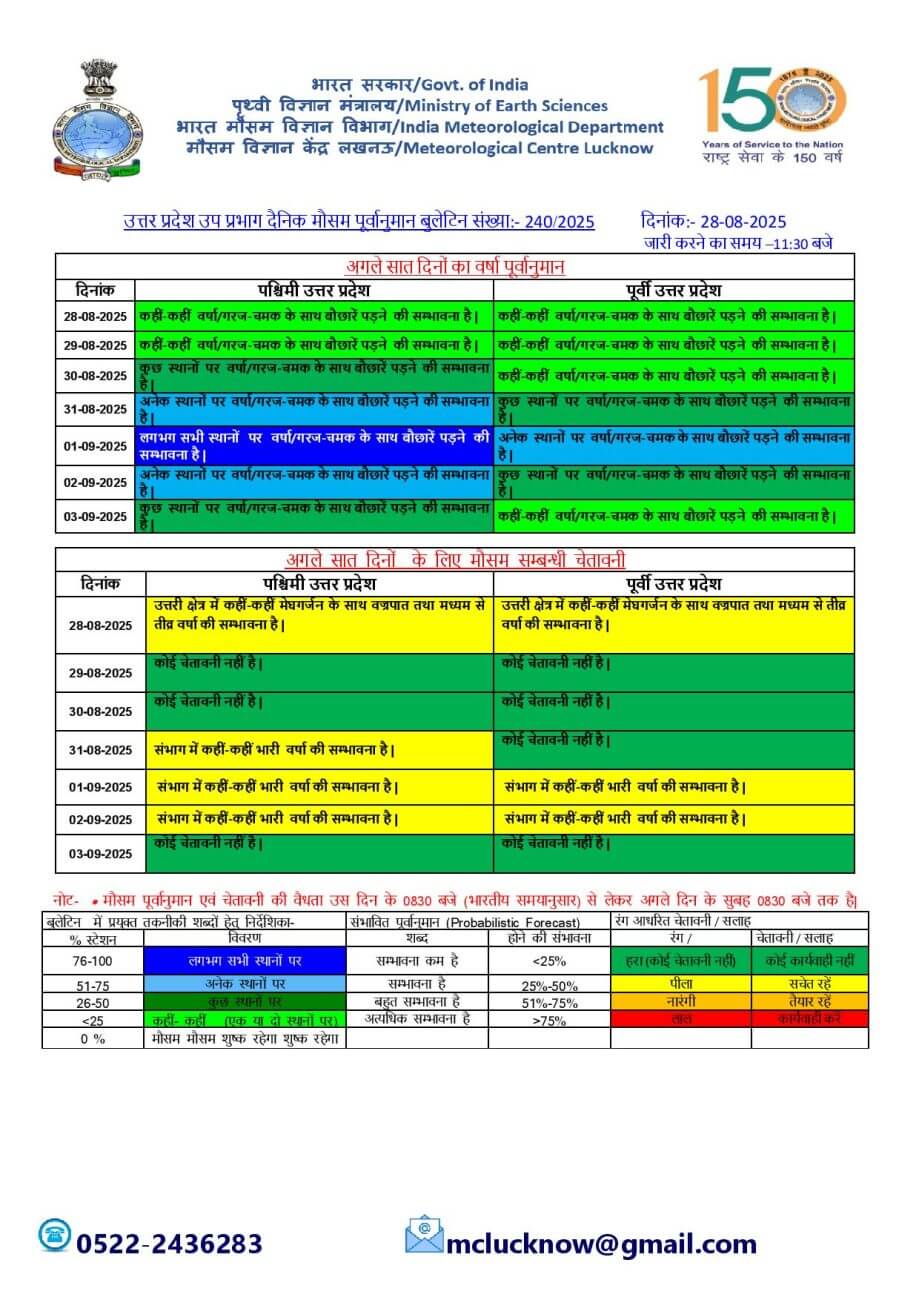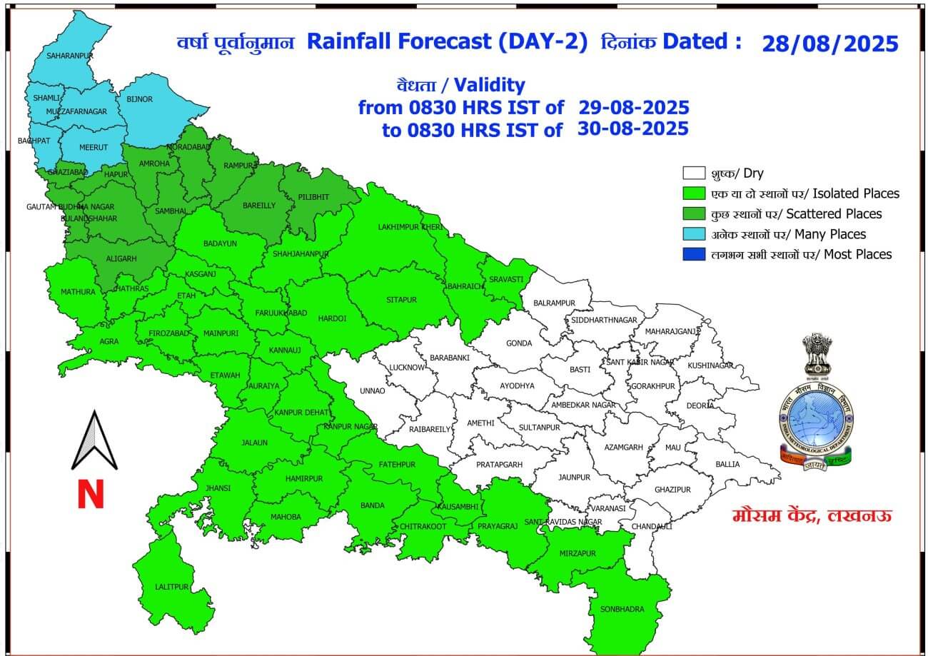 - 29-08-2025: पश्चिमी / पूर्वी यूपी में कहीं कहीं स्थानों पर वर्षा/गरज-चमक के साथ बौछारें ।