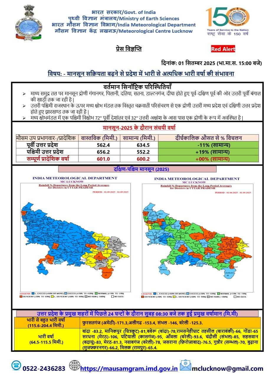 बता दे कि अब तक 01 जून से 1 सितंबर तक प्रदेश में 600.1 मिमी वर्षा हुई है, जबकि सामान्य औसत 600.2 मिमी है। हालांकि पश्चिमी यूपी में 656.2 मिमी यानि 14% ज्यादा और पूर्वी यूपी में 562.4 मिमी यानि 12% कम बारिश हुई, जो सामान्य श्रेणी में है।
