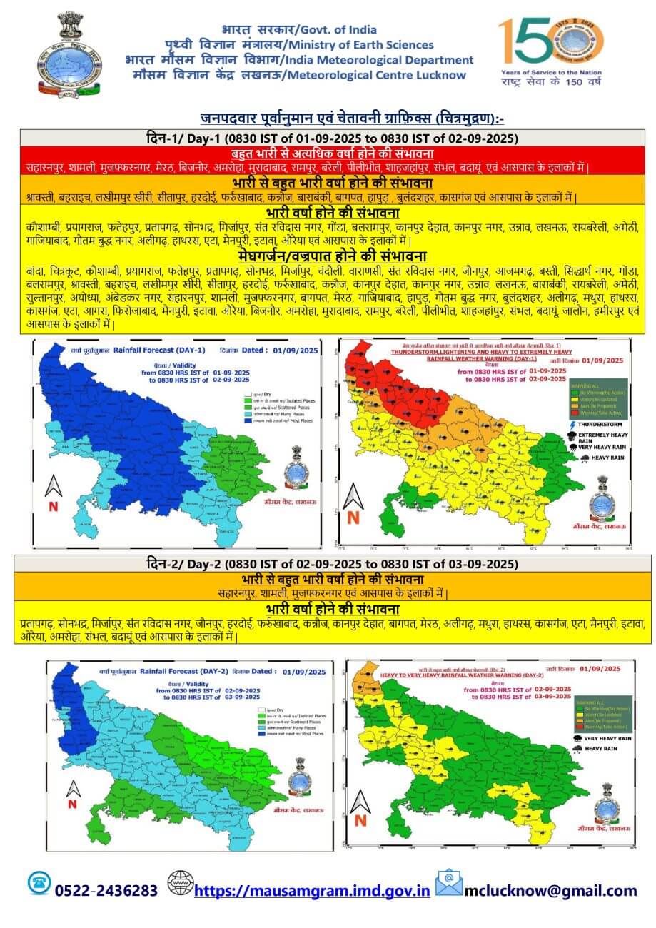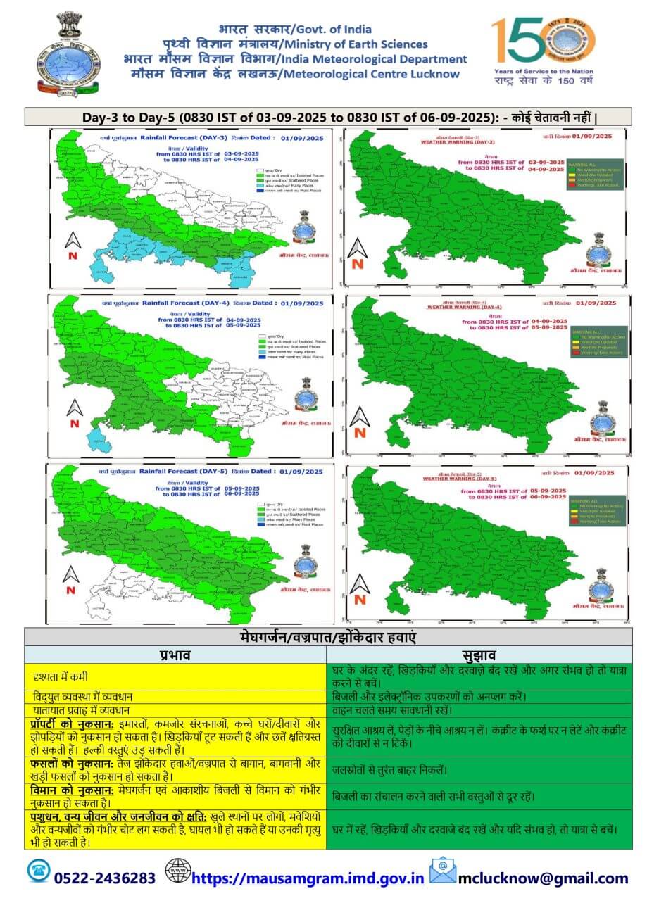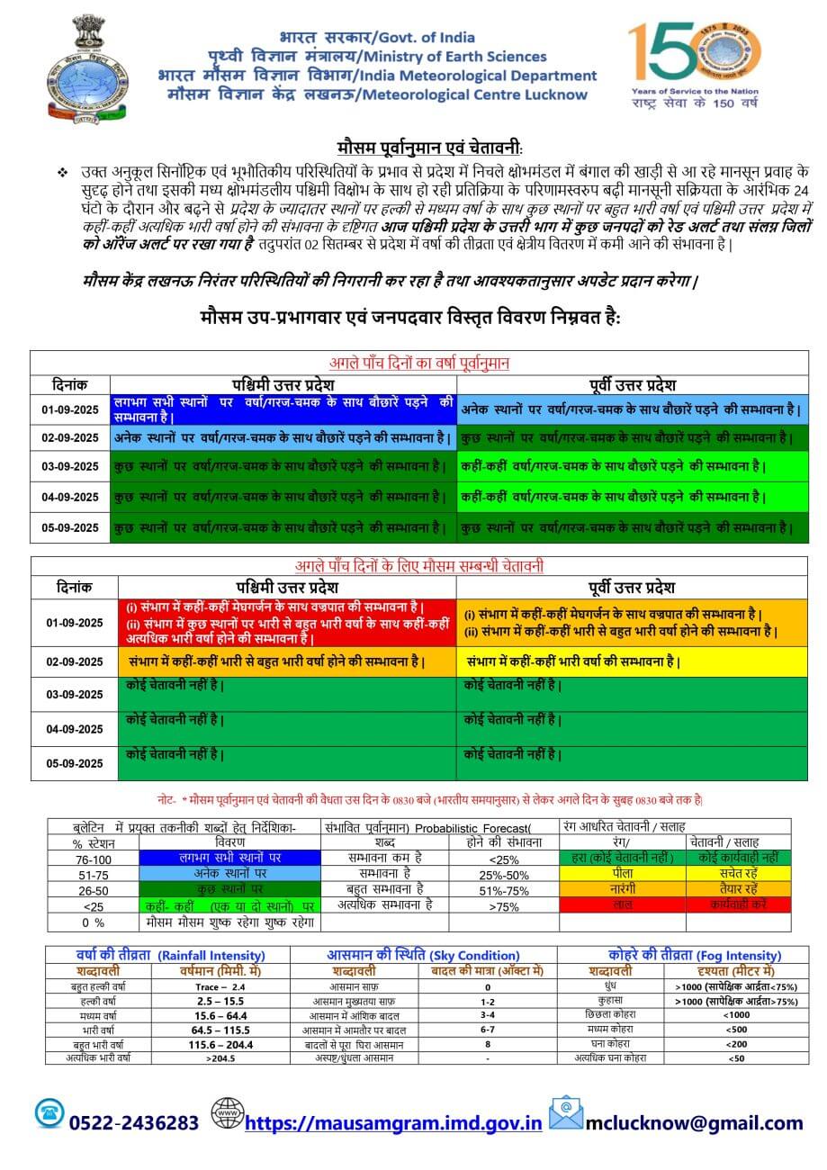 - 5-09-2025: पश्चिमी / पूर्वी यूपी में कुछ स्थानों पर वर्षा/गरज-चमक के साथ बौछारें ।