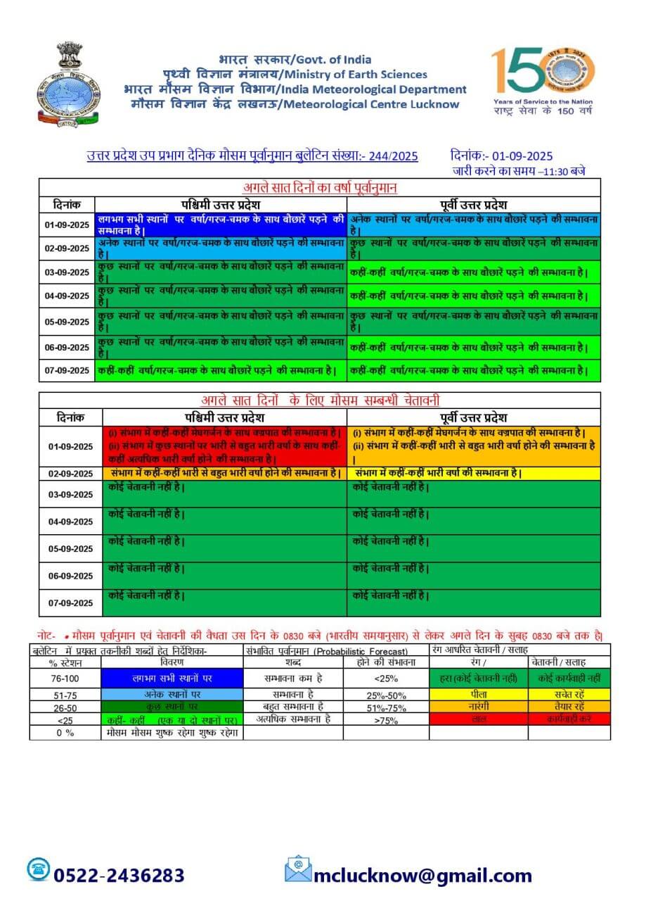- 7-09-2025: पश्चिमी / पूर्वी यूपी में कहीं कहीं स्थानों पर वर्षा/गरज-चमक के साथ बौछारें ।