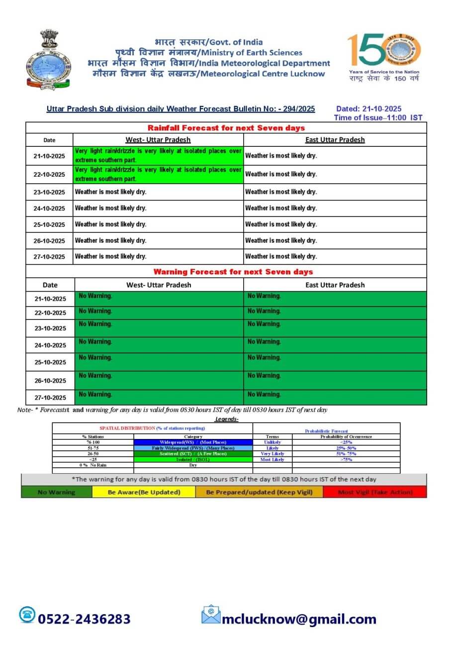 - 27-10-2025: पश्चिमी / पूर्वी यूपी में शुष्क।