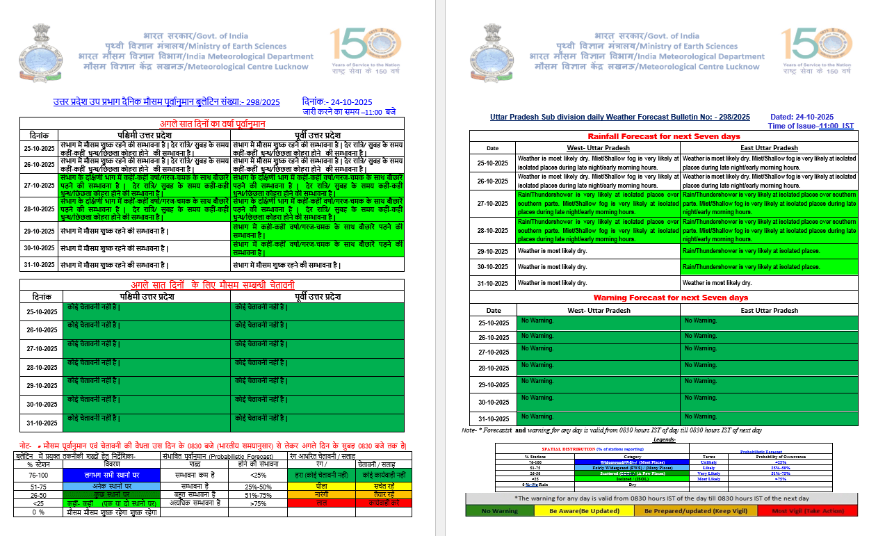 - 30-10-2025: पश्चिमी में शुष्क / पूर्वी यूपी में कहीं-कहीं पर बारिश/गरज चमक के साथ बौछारें।