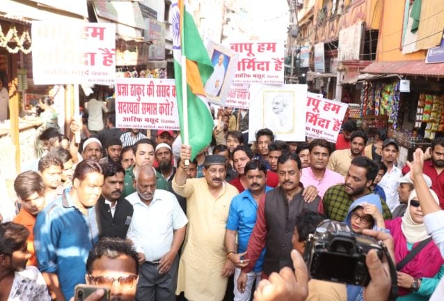 भोपाल। मध्य प्रदेश की राजधानी भोपाल से भाजपा सांसद साध्वी प्रज्ञा ठाकुर ने संसद में गोडसे को देशभक्त बताने के अपने बयान पर माफी मांग ली है। इससे पहले भी वह एक बार माफी मांग चुकी हैं। लेकिन उनपर भाजपा द्वारा कोई बड़ी कार्रवाई नहीं की। कांग्रेस ने इस मुद्दे को लेकर राजधानी में लगातार प्रदर्शन किया। मध्य विधानसभा से कांग्रेस विधायक आरिफ मसूद ने शुक्रवार को एक बार फिर जुलूस निकालकर साध्वी के इस्तीफे की मांग की।