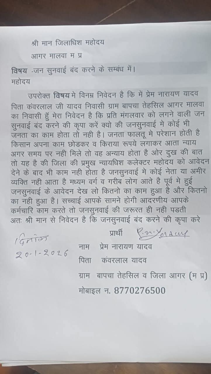 आगर मालवा। जिले में हर मंगलवार को होने वाली जनसुनवाई को लेकर एक अनोखा मामला सामने आया है। यहां एक नागरिक ने इस पूरी व्यवस्था पर सवाल उठाते हुए इसे बंद करने की मांग कर दी है। आगर मालवा तहसील के गांव बापचा निवासी प्रेम नारायण यादव ने जिला कलेक्टर को एक लिखित आवेदन देकर कहा है कि जनसुनवाई से आम जनता को कोई ठोस फायदा नहीं हो रहा है।