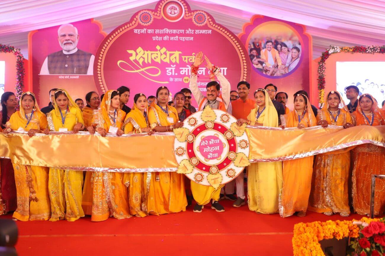 मंच पर बहनों द्वारा मुख्यमंत्री को प्रतीकात्मक बड़ी राखी भेंट की गई। इस अवसर पर मुख्यमंत्री डॉ. यादव ने 308 दिव्यांगजनों को 52 लाख 90 हजार की लागत के 569 सहायक उपकरण वितरित किये। डॉ. यादव ने कहा कि प्रधानमंत्री नरेन्द्र मोदी के नेतृत्व में निरंतर नारी सशक्तिकरण के कार्य किये जा रहे है। लाड़ली बहना योजना में आर्थिक सहायता राशि 1250 रुपए के अतिरिक्त रक्षाबंधन के पावन अवसर पर 250 रुपए राखी का अतिरिक्त उपहार भी बहनों को प्रदान किया गया है, भाईदूज से पूरे 1500 रुपए प्रतिमाह तथा धीरे-धीरे से 3000 हजार रुपए तक प्रतिमाह किया जाएगा।
