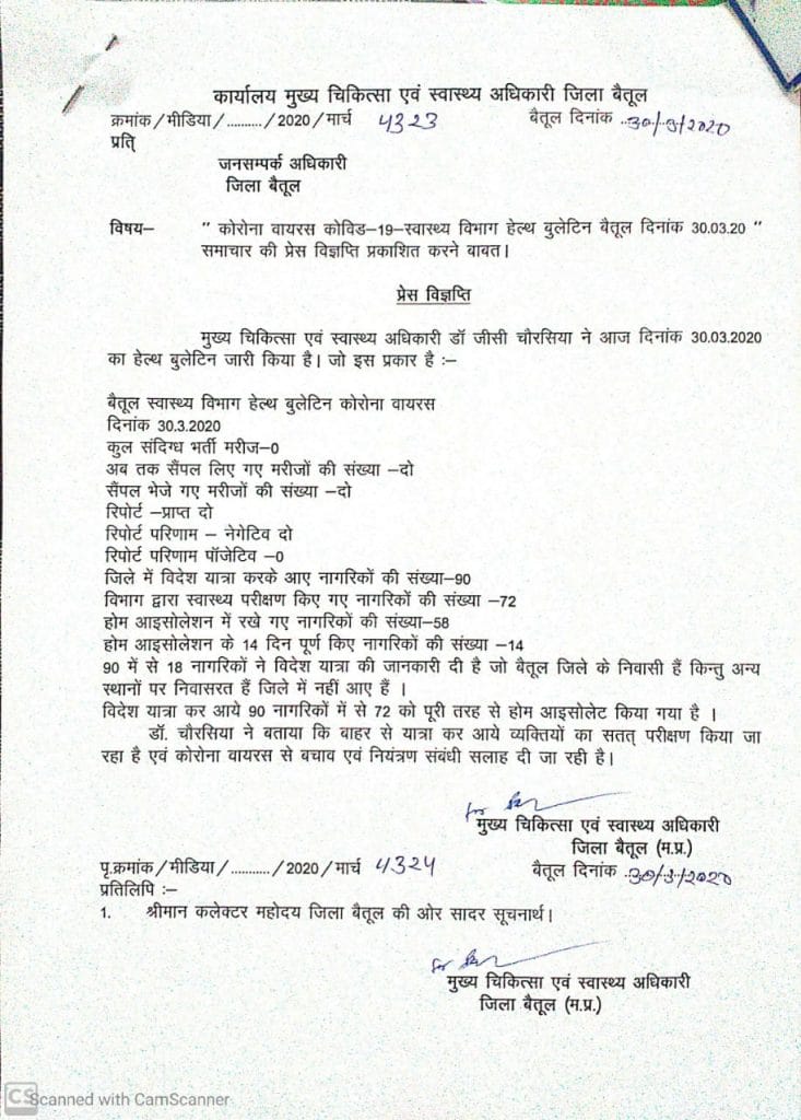 बैतूल। वाजिद खान। मध्य प्रदेश में कोरोना के कहर तेजी से बढ़ रहा है। इसी के चलते बैतूल जिले वासियों के लिए एक बड़ी राहत की खबर आई है। जिला अस्पताल में भर्ती दोनों संदिग्ध कोरोना मरीजों की जांच रिपोर्ट निगेटिव आई है। किसी को भी कोरोना बीमारी नही है। सीएमएचओ जीसी चौरसिया ने बताया कि आठनेर क्षेत्र के एक गांव एवं भैंसदेही की एक किशोरी को संदिग्ध कोरोना बीमारी के चलते जिला अस्पताल में भर्ती किया था दोनों मरीजो के सैंपल जांच के लिए भेजे थे जिनकी जांच रिपोर्ट सोमवार को आई है। दोनों की रिपोर्ट निगेटिव आई है। जिले में कोई भी कोरोना का मरीज नही है। यह खबर सम्पूर्ण जिले वासियों के लिए राहत भरी खबर है। लेकिन अभी कोरोना का संकट गया नही है। सभी को सावधानी बरतने की जरूरत है और सभी लोग लॉकडाउन का पालन करें। घर पर ही रहे आपने आप को बीमारी से बचाये। बीमारी का कोई इलाज नही है।