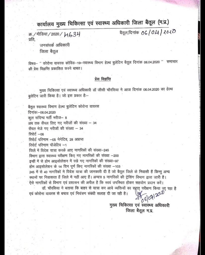 अब तक कोरोना संक्रमण से बचे हुए बैतूल में भी पहला पॉजिटिव केस सामने आ गया है। सोमवार को भैंसदेही में एक युवक की रिपोर्ट पॉजिटिव आई है और इसके बाद युवक के निवास वाले इलाके में एलर्ट कर दिया गया है। इस युवक के सेंपल शनिवार रात जिला अस्पताल में जांच हेतु लिये गए थे। यह युवक एक सप्ताह पहले 31 मार्च को नागपुर से लौटा था। अब उसे भैंसदेही के शासकीय अस्पताल में आइसोलेट किया गया है।