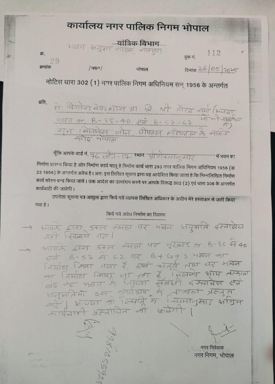 राजधानी भोपाल में बन रहे एक कमर्शियल प्रोजेक्ट में दुकानें लेने वाले दुकानदार बिल्डर की धोखाधड़ी का शिकार बन गए हैं, पीड़ित दुकानदार कलेक्टर से लेकर रेरा ऑफिस, पुलिस थाने सब जगह आवेदन देकर चुके हैं लेकिन बिल्डर के खिलाफ अब तक कोई एक्शन नहीं हुआ है, हालाँकि अवैध निर्माण की शिकायत के बाद नगर निगम ने आज एक नोटिस जरुर बिल्डर को थमाया है।
