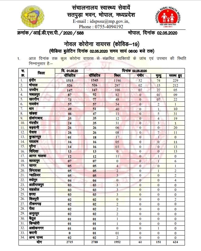 संचालनालय स्वस्थ्य सेवाएं द्वारा 6 बजे के जारी बुलेटिन (Health Bulletin) के मुताबिक राजधानी भोपाल में अब तक 526 पॉजिटिव मरीज मिले हैं| शनिवार को कोई नया मामला सामने नहीं आया| इंदौर (Indore) में 30 नए पॉजिटिव मिले हैं| इसे मिलकर कुल मरीजों की संख्या 1545 हो गई है, वहीं अब तक 74 लोगों की मौत हो चुकी है| शनिवार को इंदौर के अलग अलग रेड जोन अस्पतालों से 115 मरीज डिस्चार्ज किये गए। इधर, जबलपुर (Jabalpur) में कोरोना का कहर देखने को मिल रहा है, यहां मरीजों की संख्या लगातार बढ़ रही है| शनिवार को भी जबलपुर में चार नए मामले सामने आये| वहीं उज्जैन (Ujjain) में तीन नए मामले सामने आये हैं, इसे मिलकर जिले में 150 लोग अब तक पॉजिटिव पाए गए हैं, वहीं 29 लोग अपनी जान गंवा चुके हैं|