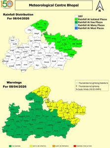 पश्चिमी विक्षोभ और चक्रवाती परिसंचरण के असर से अगले 48 घंटों तक मध्य प्रदेश में बादल-बारिश की स्थिति बनी रहेगी। बुधवार (8 अप्रैल 2026) को 18 जिलों में बादलों की आवाजाही के साथ बारिश और आंधी का अलर्ट जारी किया है। मंगलवार (7 अप्रैल 2026) शिवपुरी, दतिया, धार, पीथमपुर और झाबुआ में बादल छाए रहे और बारिश हुई। रतलाम में धूल भरी आंधी चली।