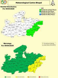 - ग्वालियर, भिंड, मुरैना, पन्ना, सतना, रीवा, मऊगंज, सीधी, सिंगरौली, मैहर, कटनी, उमरिया, शहडोल और अनूपपुर में आंधी-बारिश का दौर देखने को मिल सकता है।