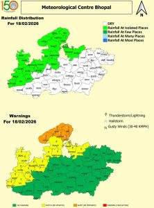 अलग-अलग स्थानों पर सक्रिय मौसम प्रणालियों के प्रभाव से आज गुरुवार को भी 8 जिलों में बारिश की चेतावनी जारी की गई है। इस दौरान कहीं-कहीं मेघगर्जन, तेज हवा के साथ बिजली चमकने की भी संभावना है। इससे पहले बुधवार (18 फरवरी 2026) को कई जिलों में तापमान 7 से 9 °C के बीच रहा। सबसे कम न्यूनतम तापमान 7.0°C करौंदी (कटनी) में दर्ज किया गया। इसके अलावा रतलाम, श्योपुर, मुरैना, मंदसौर, नीमच, गुना व शाजापुर समेत कई जिलों में तेज आंधी के साथ बारिश हुई।