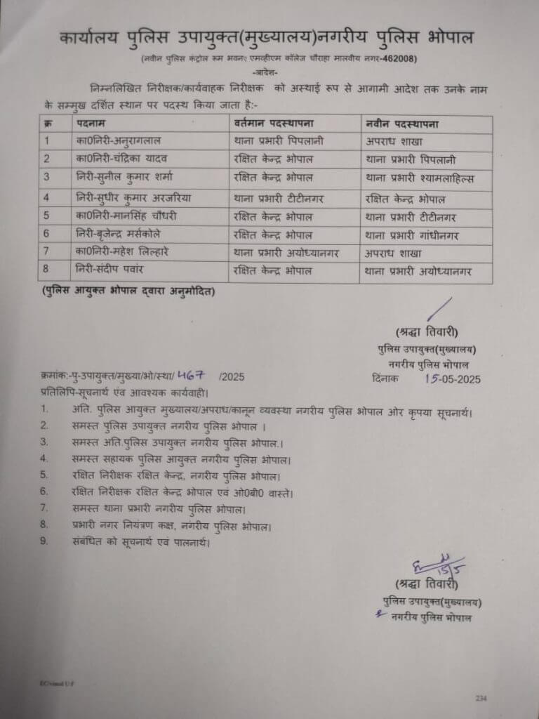 पुलिस उपायुक्त (मुख्यालय ) नगरीय पुलिस भोपाल श्रद्धा तिवारी के हस्ताक्षर से जारी आदेश में आठ पुलिस अधिकारियों के नाम हैं जिन्हें एक जगह से दूसरी जगह पदस्थ किया गया है, सूची में निरीक्षक और कार्यवाहक निरीक्षक दोनों के नाम है इसमें 4 निरीक्षक और 4 कार्यवाहक निरीक्षक हैं।