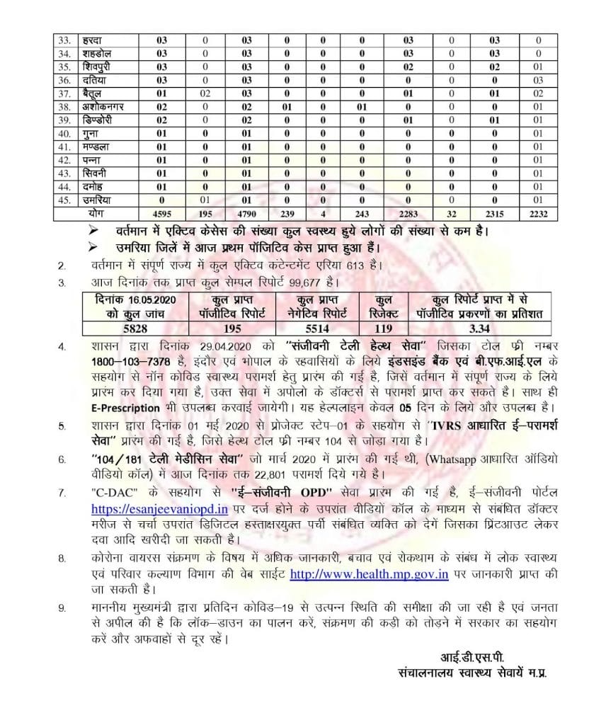 मध्यप्रदेश में आज कुल 5828 सैंपल की जांच की गई जिनमें से 119 सैंपल रिजेक्ट हो गए। शेष बचे 5709 सैंपल में से 195 पॉजिटिव पाए गए हैं। यह औसत 3.41 है| राजधानी भोपाल (BHopal) में कोरोना पॉजिटिव मरीजों की संख्या 954 पहुंच गई है। यहां अब तक 35 लोगों की मौत हो चुकी है और 525 मरीज स्वस्थ होकर वापस लौट चुके हैं। भोपाल में शनिवार को 28 नए पॉजिटिव मरीज मिले हैं| वहीं इंदौर (Indore) में 79 पॉजिटिव पाए गए। जिन्हे मिलकर इंदौर में अब तक 2378 पॉजिटिव हो चुके हैं| 99 लोगों की मौत अब तक हो चुकी है|