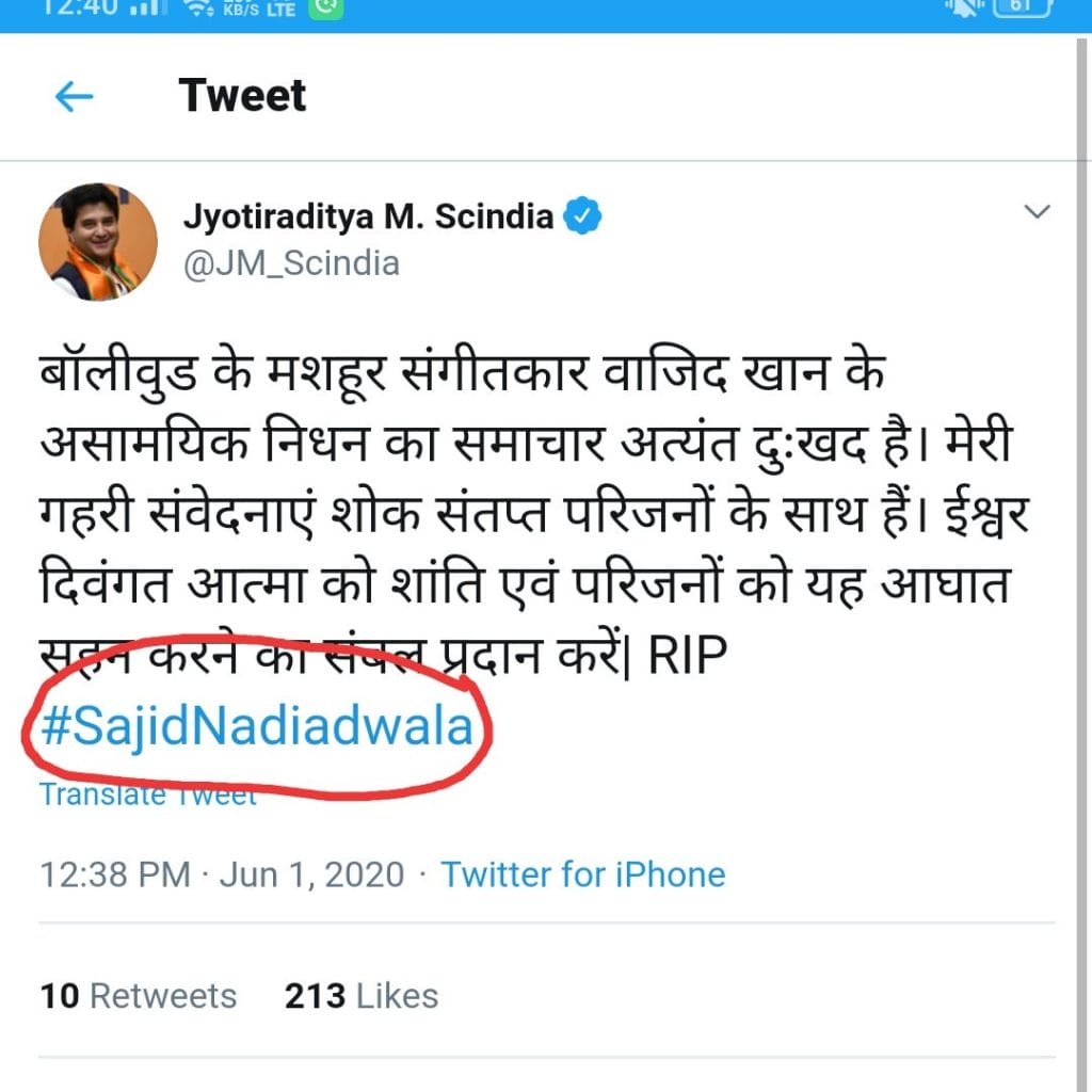 बालीवुड में साजिद-वाजिद संगीतकारों की जोड़ी प्रसिद्ध है| इस जोड़ी ने कई बड़ी फिल्मों में संगीत दिया है| इस बीच संगीतकार वाजिद खान का सोमवार को तड़के निधन हो गया| उनके निधन पर हस्तियों से लेकर उनके समर्थक तक शोक जाहिर कर रहे हैं| सिंधिया ने भी सोमवार को संगीतकार वाजिद खान के लिए शोक संवेदना ट्वीट हैंडल से जारी की। अंत में गलती हो गई और उन्होंने आरआईपी लिखकर हैशटैग के साथ साजिद नडियाडवाला लिख दिया। यह ट्वीट 12.38 मिनट पर जारी हुआ था, इसमें 213 लोगों ने लाइक किया और बाकी लोग जैसे ही कमेंट्स करने लगे। कुछ लोग गलती के लिए ट्वीट पर ही कमेंट्स करने लगे। जब तक 10 लोग उनके ट्वीट पर कमेंट्स कर चुके थे। हालांकि चंद मिनट में ही यह ट्वीट डिलिट कर दिया गया।