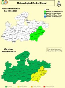 बीते दिन पचमढ़ी में रात का न्यूनतम तापमान 16.8°C और मंडला में दिन का अधिकतम तापमान 37.5°C रहा। बुधवार (8 अप्रैल 2026) को जबलपुर, भेड़ाघाट, नरसिंहपुर,बालाघाट, मऊगंज, सीधी, सिंगरौली, भिंड, श्योपुर, दतिया, रायसेन, सागर, दमोह, छिंदवाड़ा और नर्मदापुरम में गरज-चमक के साथ वर्षा हुई। भिंड व श्योपुर में ओलावृष्टि हुई।ओरछा में 52 मिमी और शिवपुरी में 29.2 मिमी बारिश रिकॉर्ड की गई।