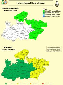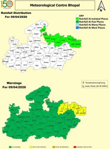 पश्चिमी विक्षोभ, ट्रफ और चक्रवाती परिसंचरण के असर से मध्य प्रदेश में 9 अप्रैल तक आंधी-बारिश का दौर जारी रहने वाला है। सोमवार को ग्वालियर-चंबल, जबलपुर, रीवा और शहडोल और सागर संभाग के 24 जिलों में बारिश की चेतावनी जारी की गई है। रविवार (5 April 2026) को उज्जैन, चंबल, जबलपुर, सागर, इंदौर, नर्मदापुरम और ग्वालियर संभाग के जिलों में कहीं-कहीं हल्की से मध्यम बारिश हुई। इससे पहले शनिवार को 14 जिलों में ओलावृष्टि और 39 जिलों में तेज आंधी-बारिश का दौर रहा। इस बेमौसम बारिश से खेतों में खड़ी फसलें आड़ी हो गई और कटी फसलें भी प्रभावित हुई है। खजुराहो में 38.0°C और मंडला में 39.5°C अधिकतम तापमान दर्ज हुआ। भोपाल में 33.4°C, इंदौर में 32.8°C, जबलपुर में 34.5°C, ग्वालियर में 33.0°C और उज्जैन में 33.0°C रहा।