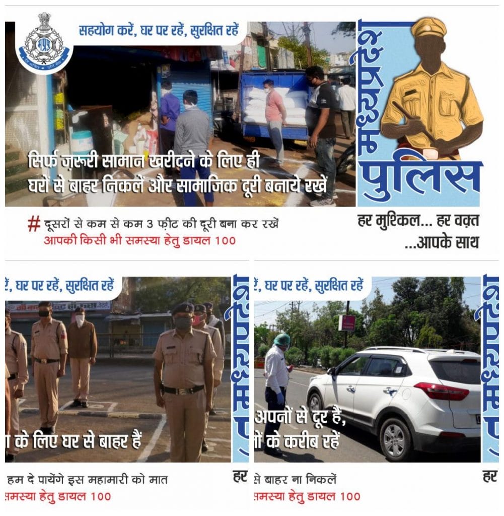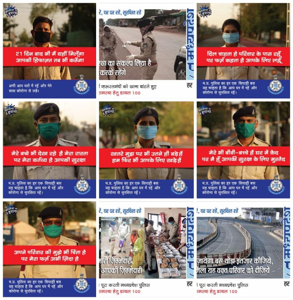 भोपाल। भोपाल के अतिरिक्त पुलिस महानिदेशक उपेंद्र जैन ने लोगों को कोरोना के संक्रमण से बचाने के लिए एक अभिनव पहल की है। उन्होंने सोशल मीडिया के माध्यम से और विभिन्न पोस्टर बैनर और गीतों के माध्यम से लोगों से कोरोना के संक्रमण से बचने की अपील की है । उपेन्द्र जैन के इस अभियान की थीम हैं, हर मुश्किल में पुलिस हर वक्त आपके साथ ।इन सोशल मीडिया संदेशों में पुलिसकर्मी लोगों को यह संदेश दिखा देते नजर आ रहे हैं कि उनका भी परिवार है, उनके भी बच्चे उनकी राह देख रहे हैं बावजूद इसके पुलिस का कर्तव्य आम जनता की सुरक्षा पहले है। मध्य प्रदेश पुलिस का हर एक सिपाही बस यह चाहता है कि आप घर में रहे और कोरोना से सुरक्षित रहें। कुछ पोस्टरों में पुलिसकर्मी ये संदेश देते नजर आ रहे हैं कि 21 दिन बाद भी वे वही मिलेंगे और आपकी सुरक्षा तब भी करेंगे ।पुलिसकर्मियों ने दिल और फर्ज में से फर्ज को चुना है और तमाम खतरों के बाद भी वह जनता की सुरक्षा के लिए दिन रात एक किए हुए हैं।