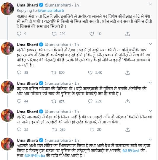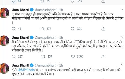 उमा भारती ने एक अन्य ट्वीट में लिखा “एक दलित परिवार की बिटिया था, बड़ी जल्दबाजी में पुलिस ने उसकी अत्येष्टि की और एक परिवार एवं गांव की पुलिस के द्वारा घेराबंदी कर दी गई है. मेरी जानकारी में ऐसा कोई नियम नहीं है कि एसआईटी जांच में परिवार किसी से मिल ना पाए “| उन्होंने आगे लिखा- “हमने राम मंदिर का शिलान्यास किया है. देश में राम राज्य लाने का दावा किया है. किंतु इस घटना पर पुलिस की संदेहपूर्ण कार्यवाही से आपकी यानि यूपी सरकार की और बीजेपी की छवि पर आंच आई है|”