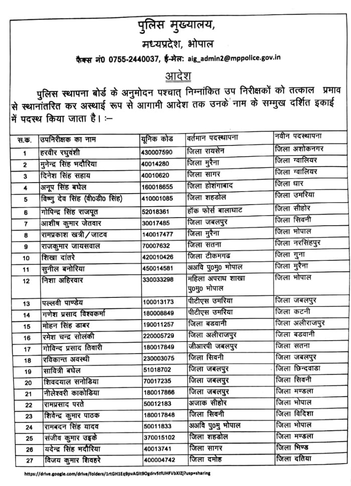 भाेपाल। मध्य प्रदेश में तबादलों का दौर जारी है| इस बार पुलिस विभाग में बड़े पैमाने पर फेरबदल हुआ है| सोमवार को एएसपी और डीएसपी रैंक के अफसरों के बाद अब राज्य सरकार ने मंगलवार को पुलिस उप निरीक्षक और सहायक उप निरीक्षकों के थोकबंद तबादले किये हैं| पुलिस स्थापना बोर्ड के अनुमोदन के बाद पुलिस मुख्यालय द्वारा तबादला सूची जारी की गई है| तबादला सूची के मुताबिक 39 उपनिरीक्षकों और 57 सहायक उप निरीक्षकों के तबादले किये गए हैं|