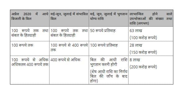 संबल के हितग्राही तथा ऐसे घरेलू उपभोक्ता जिनके बिजली के बिल अप्रैल में 100 रूपये या उससे कम आये थे तथा मई, जून, जुलाई में भी 100 रूपये से कम आयेंगे उन्हें मई, जून, जुलाई की राशि के स्थान पर सिर्फ 50 रूपये महीने का भुगतान करना होगा। इससे लगभग 63 लाख हितग्राहियों को 100 करोड़ रूपये का लाभ होगा। वहीं ऐसे घरेलू उपभोक्ता, जिनके बिजली के बिल माह अप्रैल में 100 रूपये से कम आए थे लेकिन मई, जून और जुलाई माह में 100 रुपये से अधिक परंतु 400 रुपये से कम आए हैं या आएंगे, तो उन्हें मई, जून और जुलाई माह के बिल की राशि के स्थान पर सिर्फ 100 रुपये प्रतिमाह का भुगतान करना होगा। इससे लगभग 28 लाख हितग्राहियों को 150 करोड़ रुपये का लाभ मिलेगा। जिनके बिजली के बिल माह अप्रैल में 100 रूपये से अधिक परन्तु 400 रूपये से कम आए थे किन्तु मई,जून और जुलाई माह में रूपये 400 से ज्यादा आये हैं या आएंगे, तो उन्हें मई, जून और जुलाई माह के बिल की राशि की आधी राशि का ही भुगतान करना होगा। शेष बिल की राशि की जांच के उपरांत निर्णय लिया जा सकेगा। इससे लगभग 8 लाख हितग्राहियों को बिल की राशि का आधा भुगतान ही करना होगा। हितग्राहियों को लगभग 200 करोड का लाभ होगा।