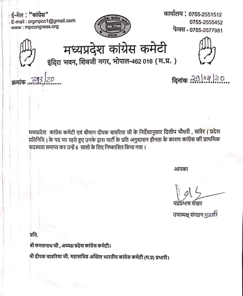 भोपाल/इंदौर। लॉक डाउन (LOCK DOWN )के बीच कांग्रेस(CONGRESS) ने बड़ी कार्रवाई की है।कांग्रेस ने सांवेर के पूर्व नगर कांग्रेस अध्यक्ष एवं प्रदेश प्रतिनिधि दिलीप चौधरी(DEELIP CHOUDHRI) को 6 साल के लिए पार्टी से निष्कासित कर दिया गया है।यह कार्रवाई जिला अध्यक्ष की शिकायत के बाद प्रदेश प्रभारी दीपक बावरिया (DEEPAK BAWARIYA)द्वारा की गई है।चौधरी को शिवराज सरकार (SHIVRAJ SARKAR)में कैबिनेट मंत्री तुलसी सिलावट(CABINET MINSTER) का समर्थक माना जाता है।