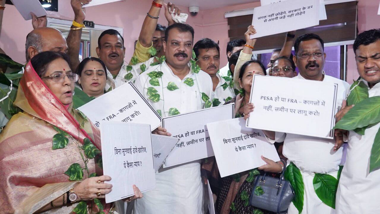 आज कांग्रेस विधायक गले में हरे पत्तों की माला पहनकर विधानसभा पहुंचे, उन्होंने इस दौरान जमकर नारेबाजी की कांग्रेस का कहना है कि वन अधिकार पट्टों के माध्यम से जो कानूनी हक आदिवासियों को मिलना चाहिए, उसे भाजपा सरकार जानबूझकर टाल रही है। यह केवल संवैधानिक अधिकारों का हनन नहीं, बल्कि उनकी आजीविका, पहचान और संस्कृति पर हमला है।