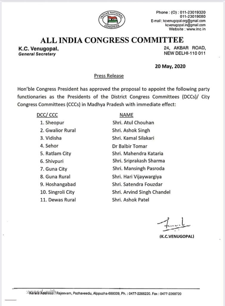 भोपाल। मध्यप्रदेश कांग्रेस ने भी उपचुनाव को लेकर तैयारियां शुरु कर दी है।बीजेपी के बाद अब कांग्रेस ने जिलाध्यक्षों की नियुक्ति कर दी है।मध्यप्रदेश कांग्रेस कमेटी के ज़िला, शहर एवं ग्रामीण कांग्रेस अध्यक्षों की सूची जारी की गई है।