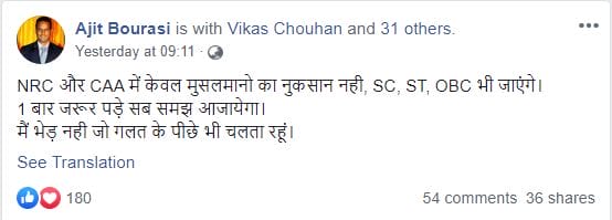 दरअसल, इंदौर जिले में बीजेपी नेता अजीत बौरासी ने मंगलवार को फेसबुक पर एक पोस्ट लिखकर सीएए (CAA) का विरोध किया है। बीजेपी नेता ने पार्टी लाइन से हटकर विरोध किया है। उन्होंने सीएए के खिलाफ अपने फेसबुक वॉल पर लिखा है, ‘मैं भेड़ नहीं जो गलत के पीछे भी चलता रहूं’ साथ ही CAA-NRC को मुस्लिमों के साथ-साथ SC, ST, OBC के लिए भी हानिकारक बताया है।जबकी 15 दिसंबर को अजीत ने इसी फेसबुक अकाउंट से नागरिकता संशोधन विधेयक के समर्थन में पोस्ट डाली थी। तब अजीत ने पोस्ट में लिखा था कि मैंने अब तक अध्यादेश को जितना समझा है उससे किसी भी हिंदुस्तानी का नुकसान नहीं है। बौरासी का यह बदला अंदाज भाजपा-कांग्रेस नेताओं को हैरान कर रहा है।