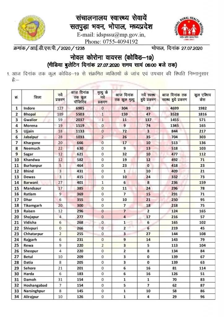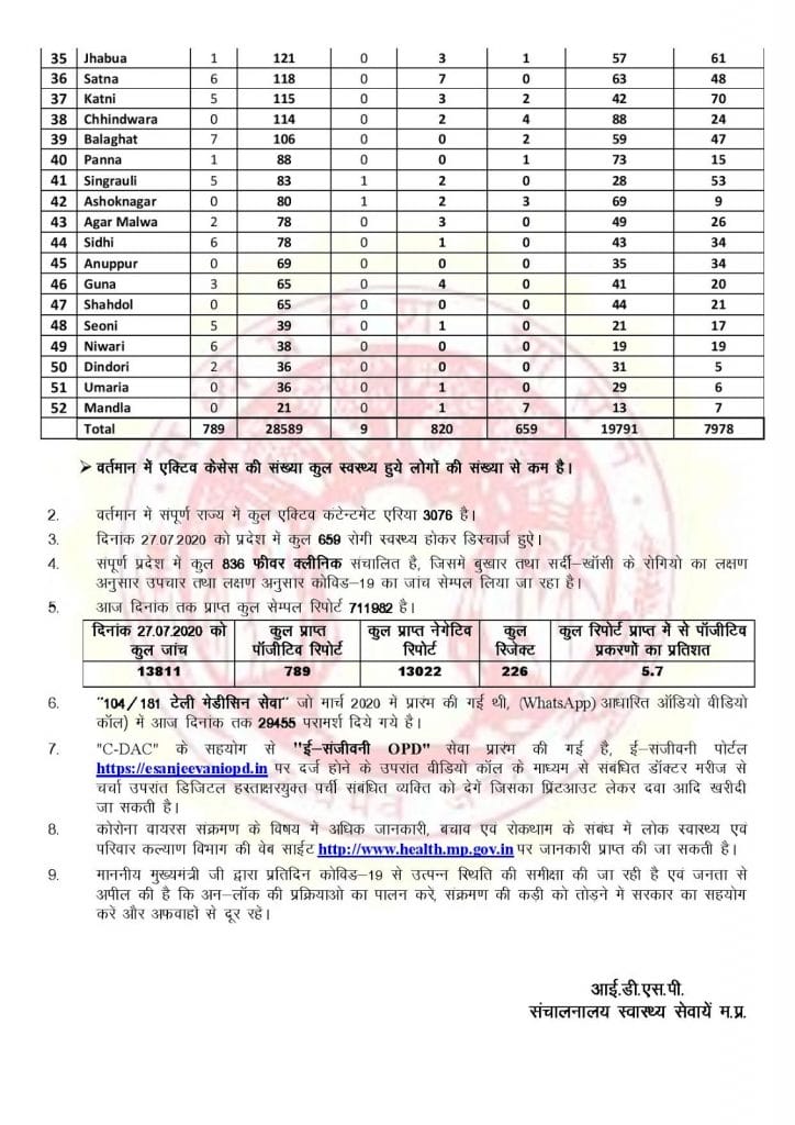 प्रदेश में पिछले 24 घंटे में 9 मरीजों की मौत हो गई। जिसके बाद प्रदेश में अब तक कोरोना से मरने वालों की संख्या 820 हो गई है| 659 मरीज स्वस्थ होकर घर लौटे। इन्हे मिलकर प्रदेश में अब तक स्वस्थ हुए नागरिकों की संख्या 19791 हो गई है| प्रदेश में एक्टिव केस की संख्या 7978 है|